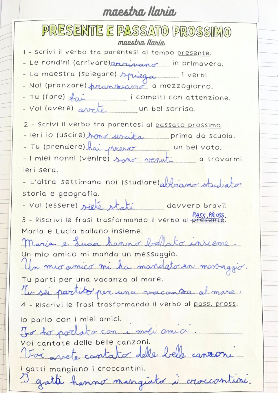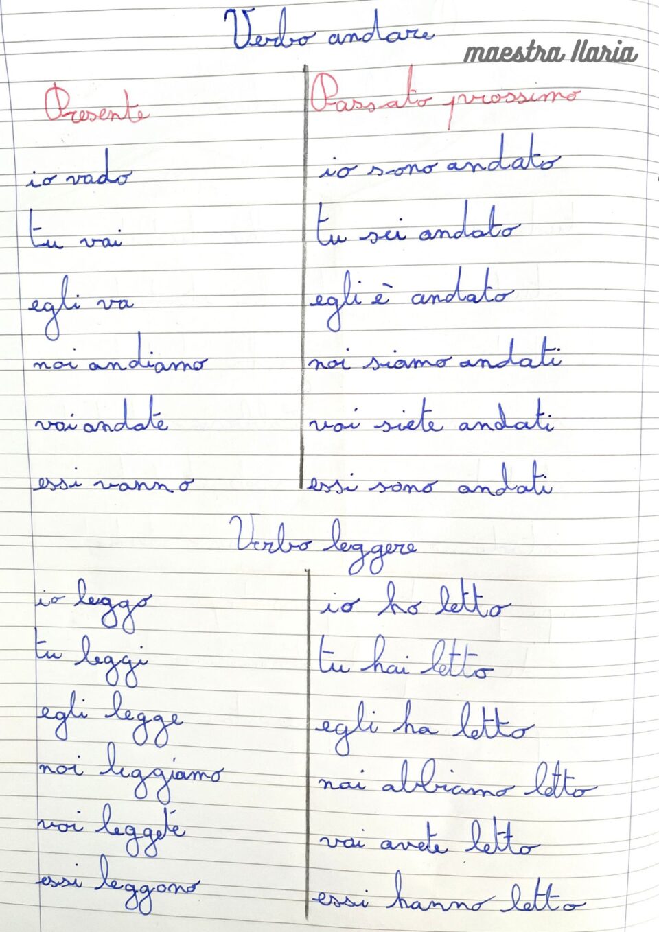 Iniziamo dal presente col passato prossimo: sono “vicini di casa” perché l’ausiliare del passato prossimo è al tempo presente. Ecco l’attività sul quaderno: