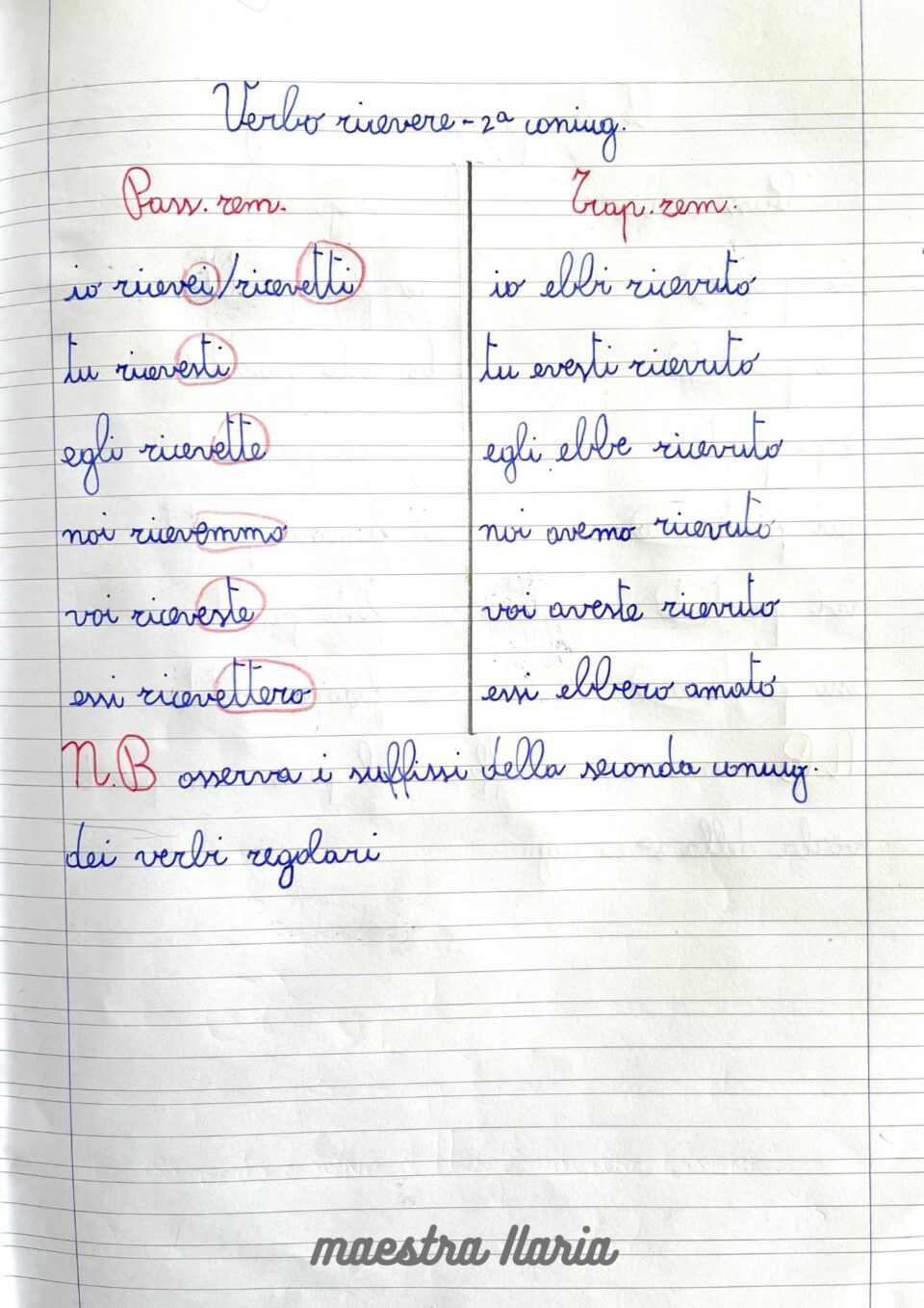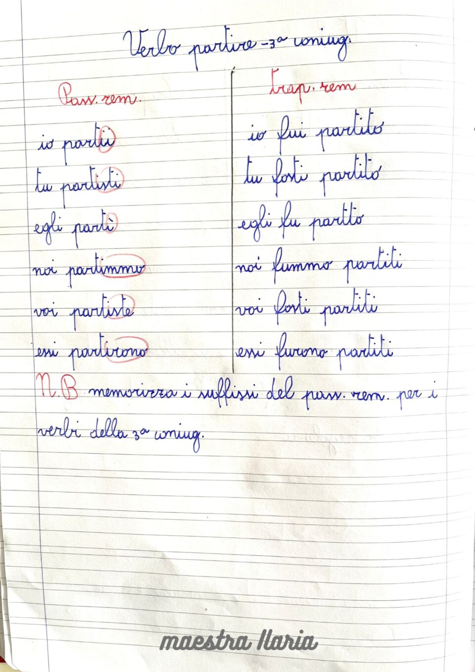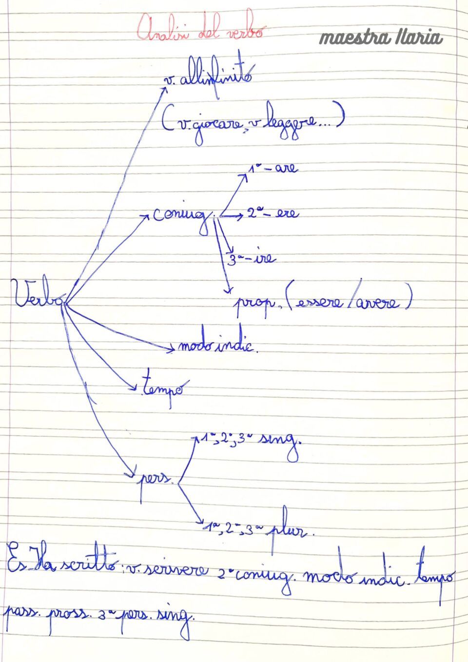 Per l’analisi grammaticale del verbo, sul quaderno abbiamo rappresentato in uno schema tutto ciò che si dovrà scrivere, poi abbiamo analizzato alcuni verbi ai tempi presente e passato prossimo.