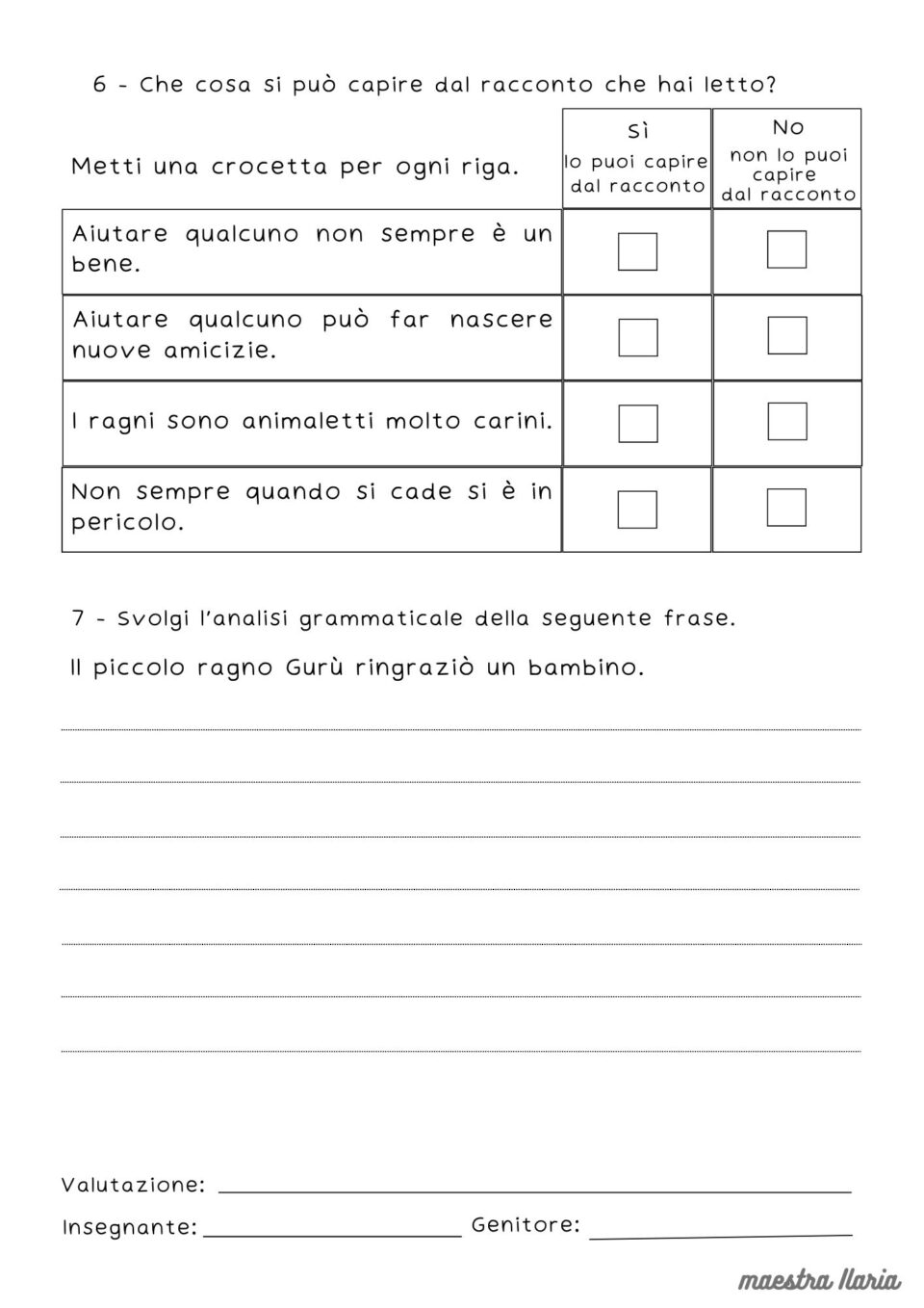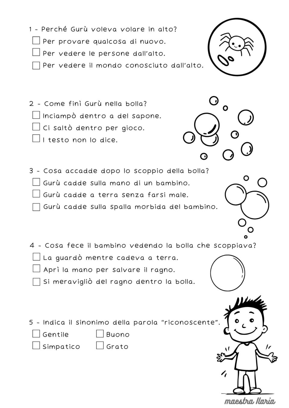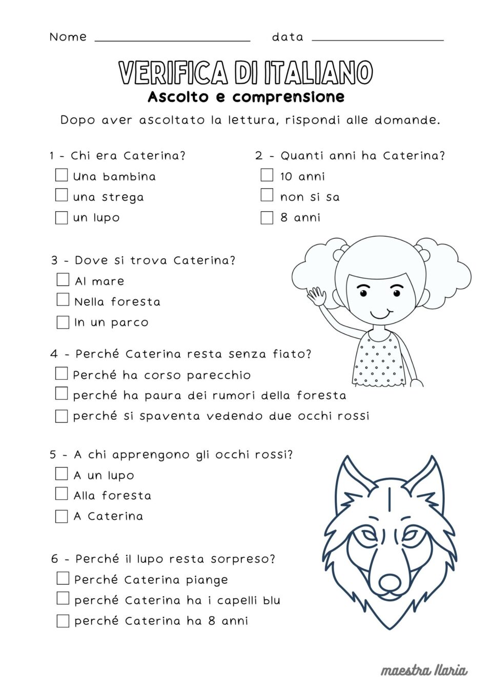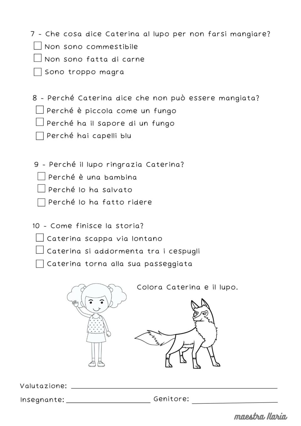 Dopo averlo ascoltato, i bambini completeranno queste schede, con domande a risposta chiusa: