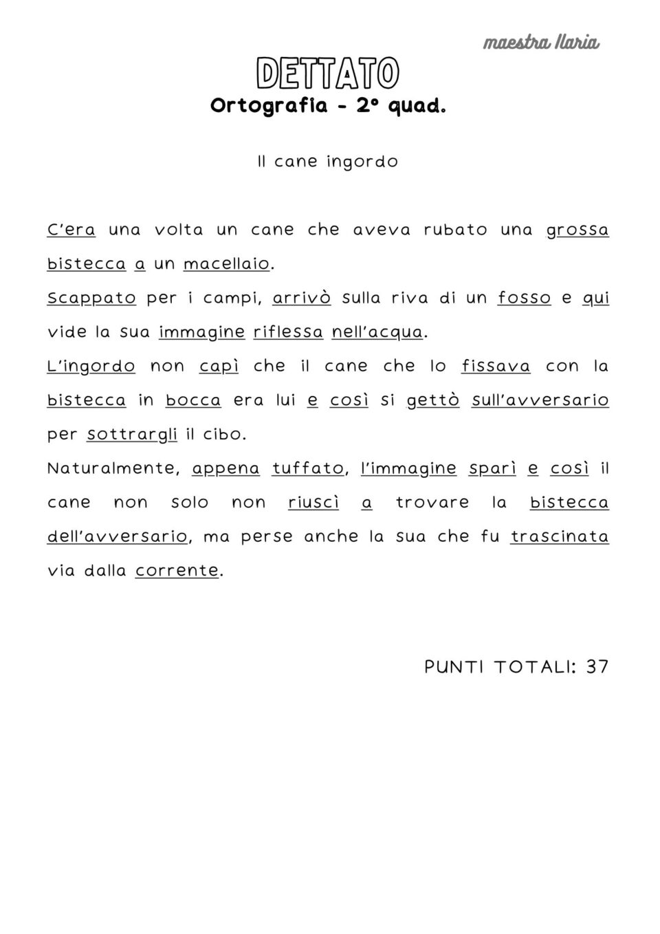 Per l’ortografia ho scelto un dettato reperito sul web, in cui ho già provveduto a sottolineare le parole con difficoltà ortografiche da valutare, con un punteggio finale.