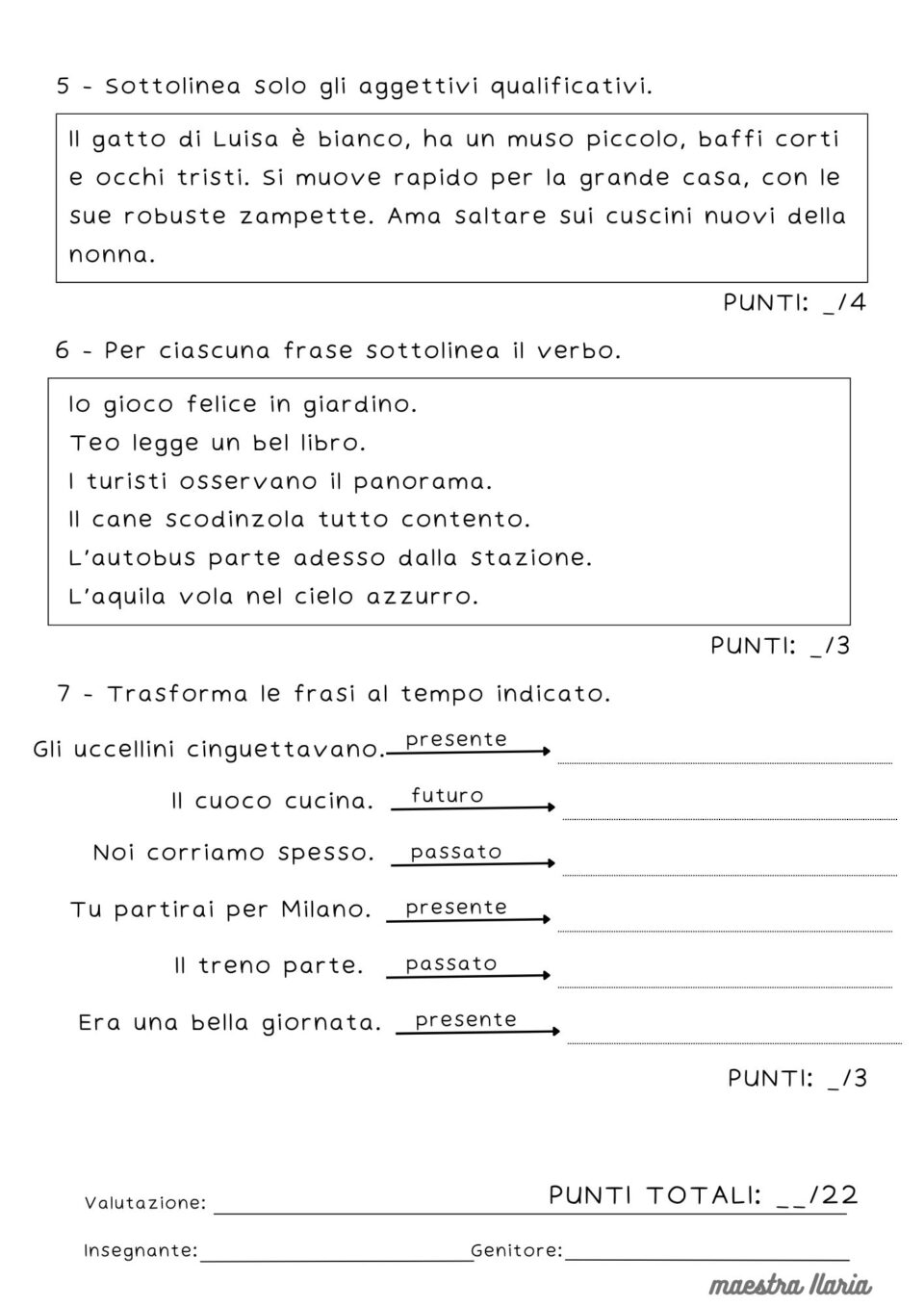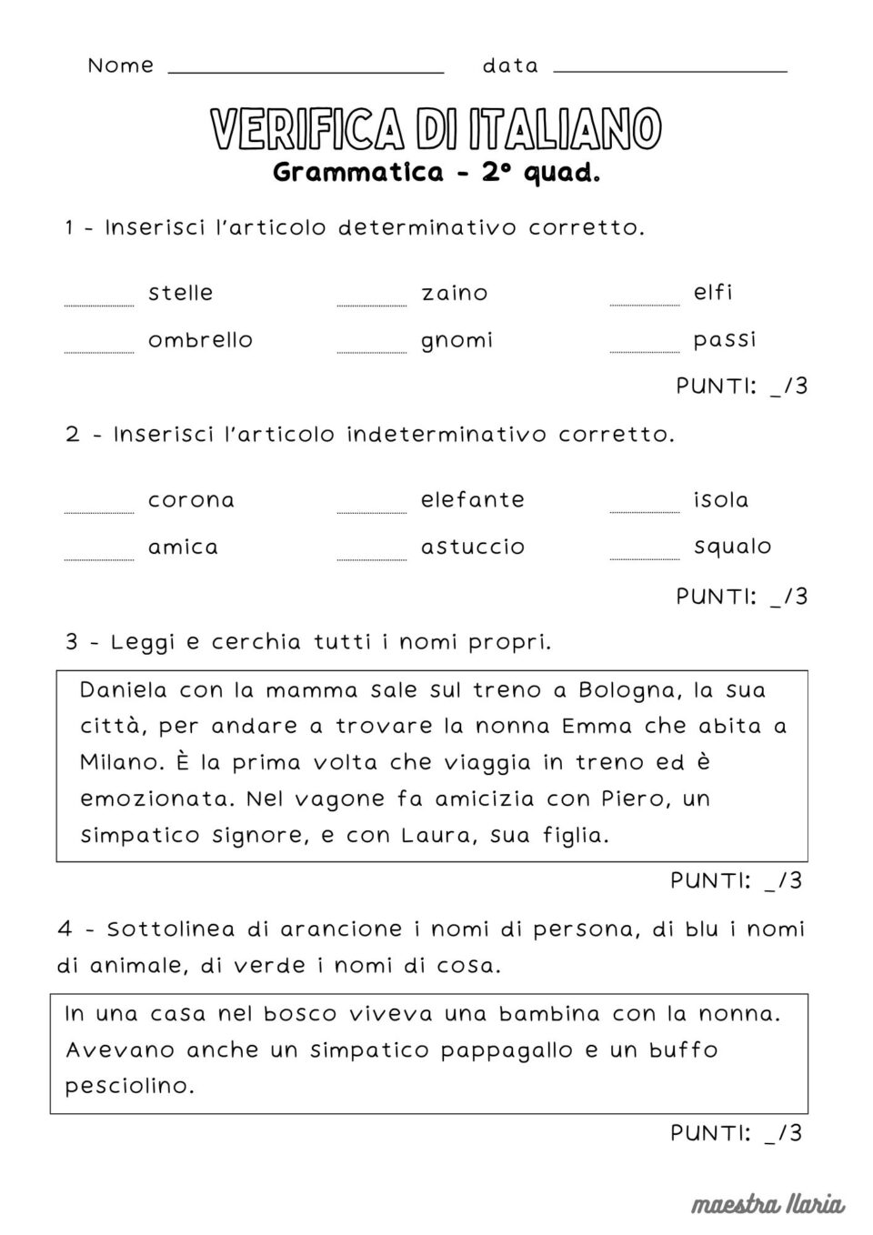 La prova di grammatica comprende tutti gli argomenti affrontati durante l’anno scolastico, dunque: articoli determinativi e indeterminativi, nomi comuni e propri, aggettivi qualificativi e verbi.